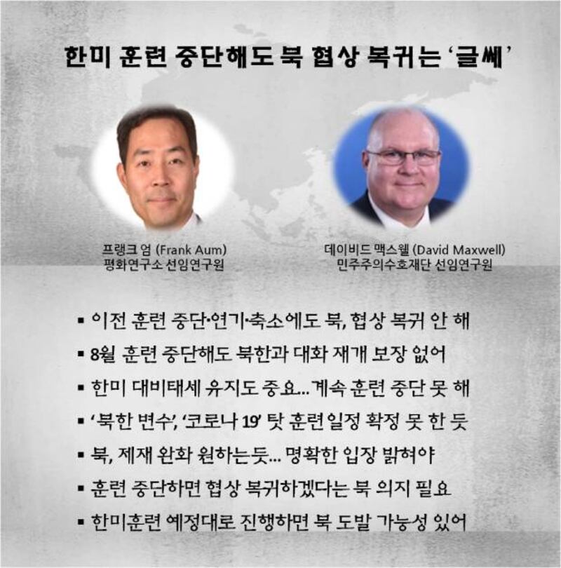 미 국방장관실 선임보좌관을 지낸 프랭크 엄 평화연구소 선임보좌관과 한미연합사령부 작전 참모 출신의 데이비드 맥스웰 민주주의 수호재단 선임연구원은 최근 RFA 자유아시아방송에 북한의 입장에서 한미연합 군사훈련의 중단만으로는 대화 재개와 협상 복귀의 전제 조건으로 충분치 않다고 강조했습니다.